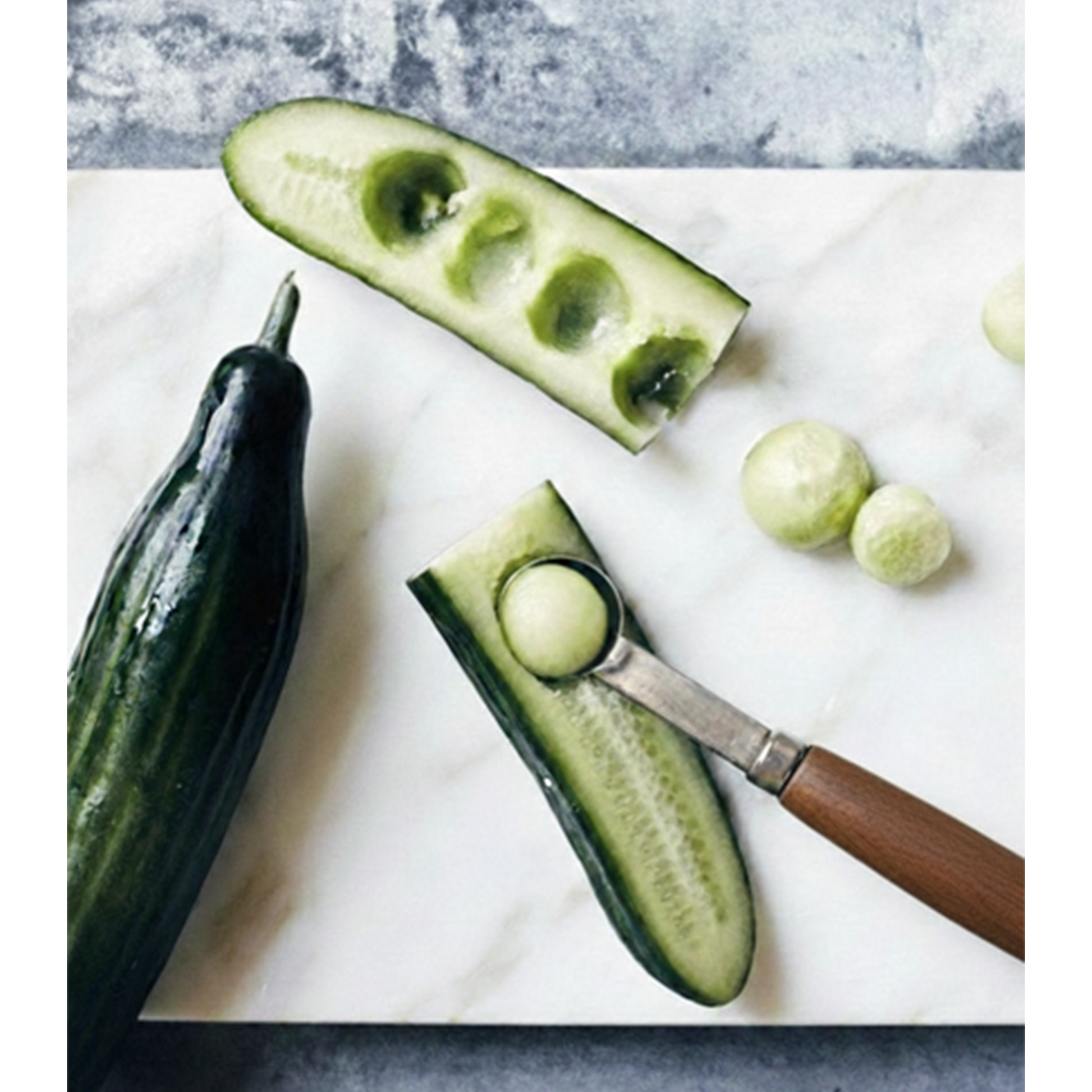 A cucumber/fruit baller is a small handheld tool that scoops round spheres from soft fruits and vegetables, adding a clean, polished look to dishes and cocktail garnishes.